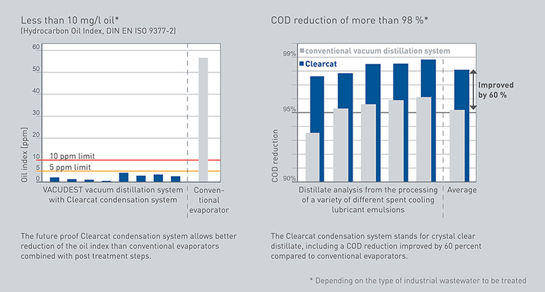 Az ipari szennyvíz kémiai oxigénigényének és olajindexének megfelelő mértékű lecsökkentéséhez összetett, többlépcsős kezelési folyamatokra van szükség annak érdekében, hogy újra fel lehessen használni a gyártási folyamatban, valamint hogy a csatornarendszerbe lehessen vezetni. A küldetésünk a szennyvízmentes termelés, és ezért szüntelenül innovatív megoldásokon dolgozunk. Ilyen megoldás  a szabadalmaztatott Clearcat kondenzációs rendszer. A csúcstechnológiás VACUDEST vákuum desztillációs berendezésekhez tartozó rendszer lehetővé teszi az olajos ipari szennyvíz feldolgozását egyetlen lépésben, hatékonyan és megbízhatóan. A kezelt víz minősége kimagasló színvonalú és még a legmagasabb környezeti elvárásoknak is megfelel. A VACUDEST vákuum desztillációs rendszerek 70%-a fel van szerelve a Clearcat kondenzációs rendszerrel. (US szabadalomszám: US 8,206,558 B2)