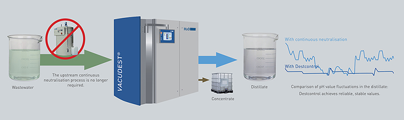 A Destcontrol pH regulátor helyet takarít meg Önnek. Ennek a technológiának köszönhetően, közvetlenül a VACUDEST-be építve, teljesen felváltja a lúgos vagy enyhén savas vizek folyamatos közömbösítési igényét. A minőséget is szabályozza, például galvanizáló öblítő vizeknél.