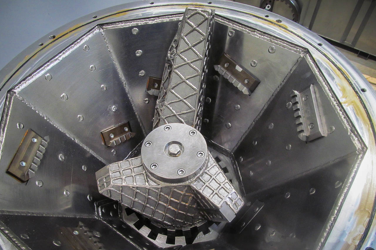 A hosszú és gyapjas, hűtőfolyadékot is tartalmazó aprítandó forgács szállítószalagon vagy kocsin kerül az adagoló tölcsérbe. Az edzett aprítószerszámokkal ellátott forgó késfej a teljes forgácslabdát a zúzótölcséren rögzített edzett tépőtömbök ellen mozgatja. Az elő-zúzott forgács leesik az őrlőmalomba, ahol a minimális méretre aprítódik. A véletlenül bekerült durva fémdarabok kilökődnek. Ezzel a forgácstörővel még a legkeményebb forgácsok is szétapríthatók.
