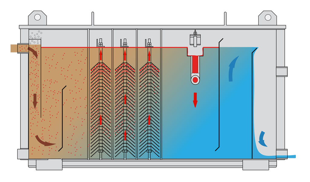 A gravitáció (a nehéz fázis süllyedése) és a koaleszcencia (a cseppek összeolvadása) segítségével a könnyű fázis lebegve halad át a rendszeren, és folyamatosan kiürül.